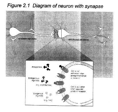A researcher needs certain key tools in order to understand how a drug acts on the brain. To appreciate the importance of these tools, one must first understand some basic principles of drug action. All recent studies have indicated that the behavioral effects of THC are receptor-mediated.27 Neurons in the brain are activated when a compound binds to its receptor, which is a protein typically located on the cell surface. Thus, THC will exert its effects only after binding to its receptor. In general, a given receptor will accept only particular classes of compounds and will be unaffected by other compounds.
