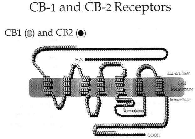 · The most far-reaching of the recent advances in cannabinoid biology are the identification of two types of cannabinoid receptors (CB1 and CB2) and of anandamide, a substance naturally produced by the body that acts at the cannabinoid receptor, and has effects similar to those of THC. The CB1 receptor is found primarily in the brain, and mediates the psychological effects of THC. The CB2 receptor is associated with the immune system, its role remains unclear.