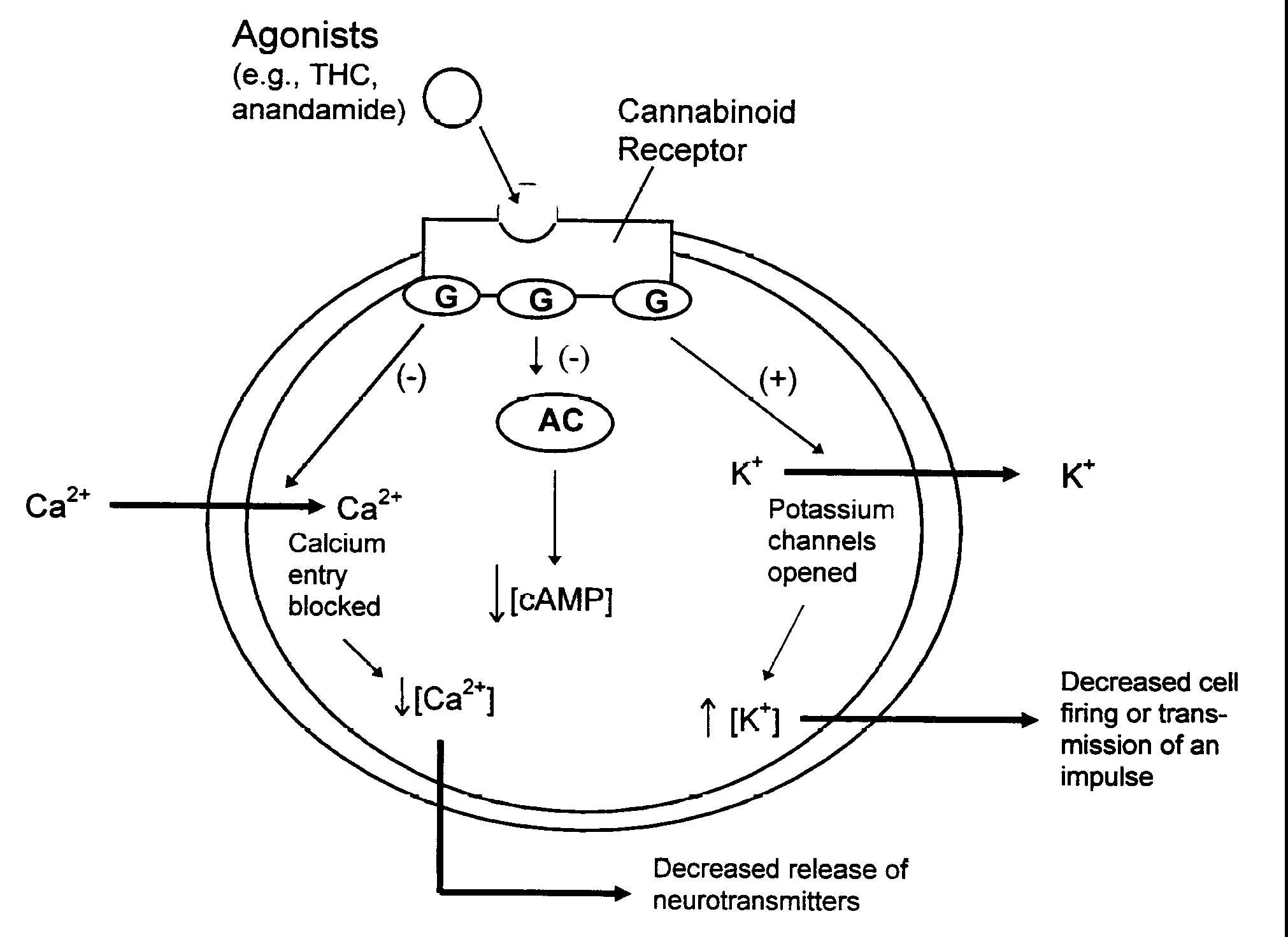 The cell responds in a variety of ways when a ligand binds to the cannabinoid receptor (figure 2.3). The first step is activation of G-proteins, the first components of the signal-transduction pathway. That leads to changes in several intercellular components - such as cyclic AMP and calcium and potassium ions - which ultimately produce the changes in cell functions. The final result of cannabinoid receptor stimulation depends on the particular type of cell, the particular ligand, and the other molecules t hat might be competing for receptor binding sites. Different agonists vary in binding potency, which determines the effective dose of the drug, and efficacy, which determines the maximal strength of the signal that they transmit to the cell. The potency and efficacy of THC are both relatively lower than those of some synthetic cannabinoids; in fact, synthetic compounds are generally more potent and efficacious than endogenous agonists.