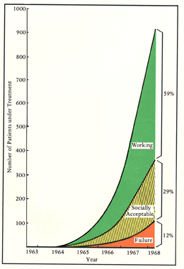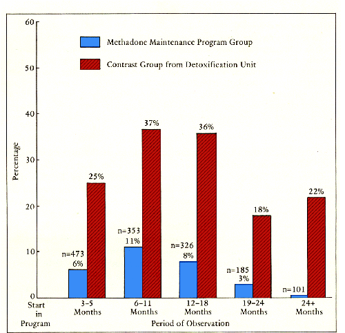 Chapter 15. How well does methadone maintenance work? The number of patients on the Dole-Nyswander program increased from 6 when Dr. Dole first discussed the program with Dr. Trussell early in 1965 to 1,866 on October 31, 1969. 1 During the following year, the number almost doubled--- to 3,485 on October 31, 1970 . 2 By then there were 42 centers in New York City, plus 4 in Westchester County, distributing methadone to patients under the Dole-Nyswander aegis. 3 In addition, there were numerous city, state, and private methadone maintenance programs in the New York area, and a number of physicians were prescribing methadone maintenance for their private patients. The discussion below concerns primarily the 3,485 patients attending the 46 Dole-Nyswander clinics, since the data available on these patients are among the most complete and most reliable in the entire history of addiction treatment programs. At Dr. Dole's request, Dr. Trussell arranged for the establishment of an independent "evaluation unit" in the Columbia University School of Public Health. This unit is not responsible to Dr. Dole but to an independent committee, which includes a number of the country's outstanding authorities on narcotics addiction and on drug research. Dr. Henry Brill, New York State Associate Commissioner of Mental Health and chairman of the American Medical Association Committee on Narcotic Drugs, was selected as chairman of the evaluation committee. A few years before, following a study of narcotics addiction policies in Great Britain, Dr. Brill had published a report declaring that American addicts should not be supplied with drugs. Another member appointed to the committee, Dr. Donald B. Louria, was also at the time of his appointment an outspoken opponent of maintenance programs. As operating chief of the evaluation unit, Dr. Frances Rowe Gearing was selected--- a public-health authority widely known for her independence of mind and judgment. Thus the cards were stacked against over optimism in several ways--- by selecting as the evaluation center the same school of public health that had revealed the zero success rate of the Riverside program, by selecting an evaluation chairman opposed to maintenance programs, and by providing that the evaluation unit should assemble data independently, in addition to reviewing the data supplied by Dr. Dole. Data collection and the publication of interim reports were to proceed simultaneously with the experiment, so that failure would not be discovered too late, after many millions had been spent--- as in the case of the Riverside and New York State programs. Dr. Gearing reported on the Dole-Nyswander patients at three methadone maintenance conferences held in New York in 1968, 1969, and 1970; Dr. Dole also reported at each of these conferences. The details below are based on all six reports. Among the first 2,325 patients admitted to the Dole-Nyswander program after January 1964, all but 459 were still on daily methadone in October 1969--- a dropout rate of 20 percent. 4 By October 1970, admissions had increased to a total of 4,376--- but the dropout rate remained 20 percent. 5 Thus the methadone maintenance "success rate" might from one point of view be considered 80 percent. It is important to note, however, that in this and other methadone maintenance programs, methadone per se is successful in 100 percent of all cases, or virtually 100 percent, if success is defined as it is for other drugs. Insulin, for example, lowers the blood sugar level in very nearly 100 percent of all diabetes patients. Methadone similarly relieves the craving for heroin in all or substantially all heroin addicts. There is another sense, however, in which methadone is not quite that successful. The parallel with insulin will explain this discrepancy. If a significant proportion of diabetics were to try insulin for a while and thereafter refuse to take it any longer, we would conclude that the drug was a therapeutic failure in such cases even though it was a pharmacological success. Applying this standard to the Dole-Nyswander program, the success rate is about 97 percent; only 3 percent of those entering the program drop out voluntarily. 6 (The reasons for higher voluntary dropout rates in less successful methadone maintenance programs are discussed in Chapter 18.) One percent died,* and might also be deemed failures. When it is recalled, however, that these were all hard-core addicts, who had in the past injected heroin daily for years, that 75 percent of them had damaged livers before coming on the program, and that they suffered on admission to the program from the many other health handicaps, reviewed earlier, common to poverty-stricken addicts dependent on high cost, adulterated, and contaminated heroin, the deaths must be attributed at least in part to the sequelae of being a heroin addict rather than to methadone failure. In many or most fatal cases it would be reasonable to conclude that death ensued because methadone came too late. These were like the casualties occurring in a war after a truce had been agreed to--- or like the diabetics who continued to die prematurely for several years after insulin became available in 1923.