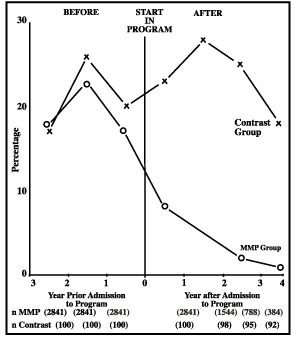 Yet, once again, that is precisely what happened. Within three months of starting methadone maintenance, more than half of the male addicts were productively employed or attending school. After a year the proportion rose to nearly two-thirds. Figure 5 shows changes in employment and in socially acceptable--- that is, arrest-free-behavior over a forty-two-month period.