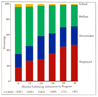 FIGURE 8. Employment Status And School Attendance for 466 Women Dr. Gearing's 1970 report showed further improvement in employment and a further decline in welfare recipients during the most recent year. Figures 7 and 8, illustrating this further improvement, are based on 2,880 man-years and 721 woman-years of experience on methadone maintenance. Once again, the only possible conclusion is that the great majority of addicts placed on methadone, despite such preexisting handicaps as poverty, poor health, little education, prison records, and years of addiction, become self-supporting as well as law-abiding while on methadone--- and the longer a group of addicts remains on methadone, the greater the number of members who become self-supporting. The 1969-1970 employment record of these ex-addicts is particularly impressive because it occurred during a period of high and rising nationwide unemployment, when even nonaddicts had trouble finding and holding jobs. The record would no doubt have been substantially better had New York City enjoyed full employment. The proportion of methadone maintenance patients on welfare in 1970 was probably only a little higher than the proportion among their neighbors, of the same ethnic group and socioeconomic status, who had never touched heroin. The employment record of methadone maintenance patients was also remarkable in the face of a systematic discrimination against them. Attention was called to this discrimination in 1971 by Ronald Bayer of New York's Greenwich House methadone maintenance program: