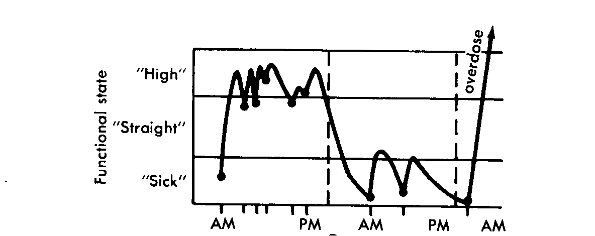 Dr. Vincent Dole."' Fig. 1. Diagrammatic summary of the functional state of a typical "mainline" heroin user. Arrow shows the repetitive injection of heroin in uncertain dose, usually 10 to 30 mg but sometimes much more. Note that the addict is hardly ever in a state of normal function ("straight").