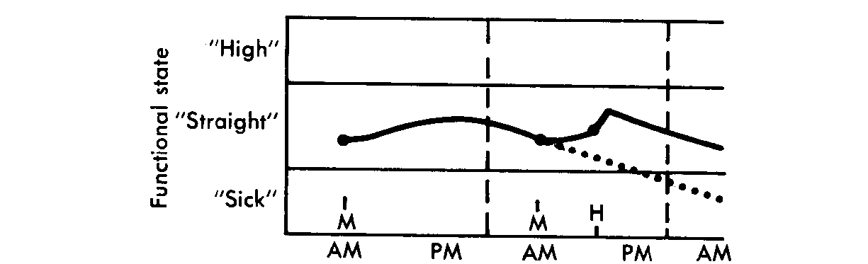 Fig. 2. Stabilization of the patient in a state of normal function by blockade treatment. A single, daily, oral dose of methadone prevents him from feeling symptoms of abstinence ("sick") or euphoria ("high"), even if he takes a shot of heroin. Dotted line indicates the course if methadone is omitted.