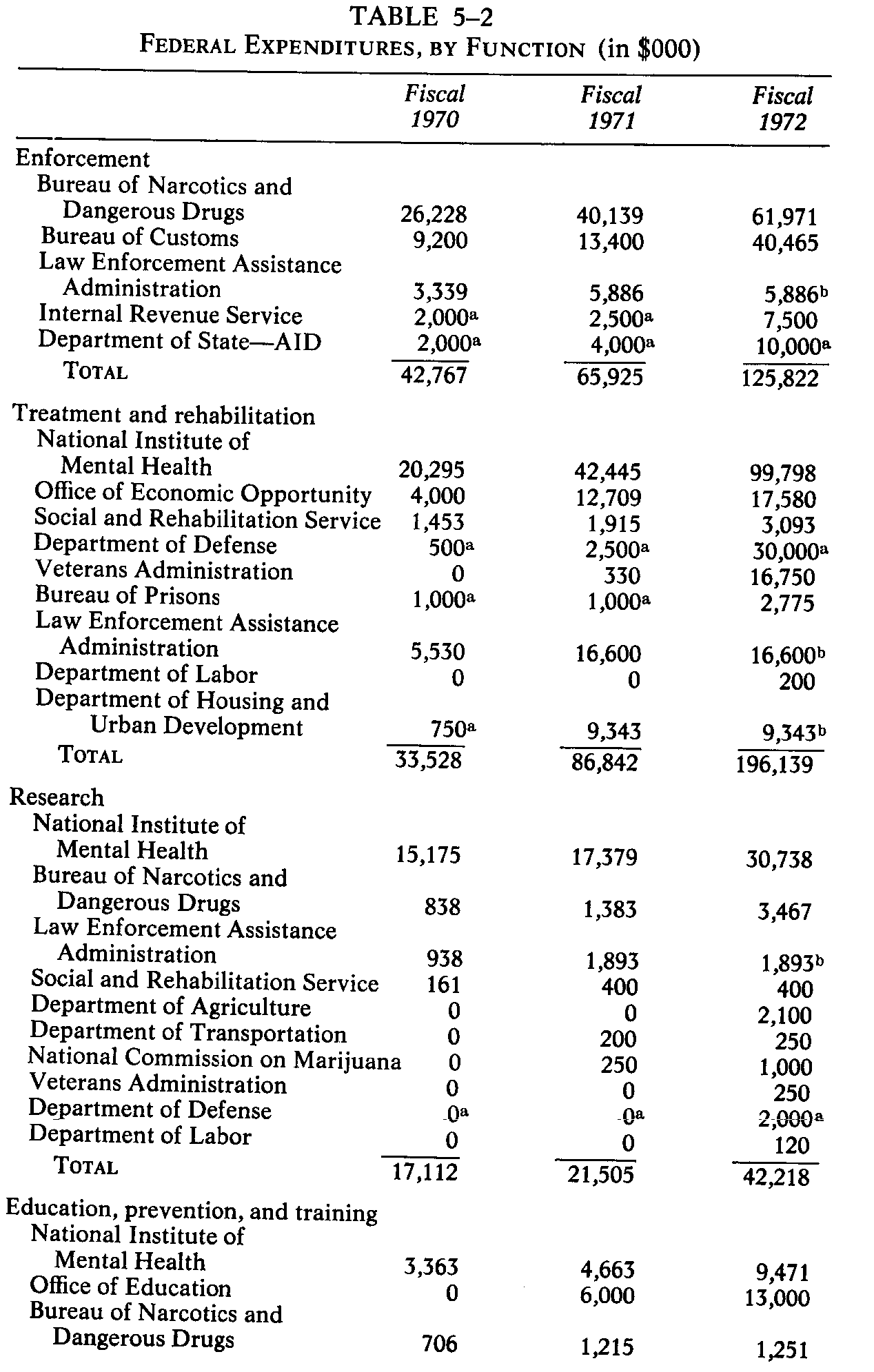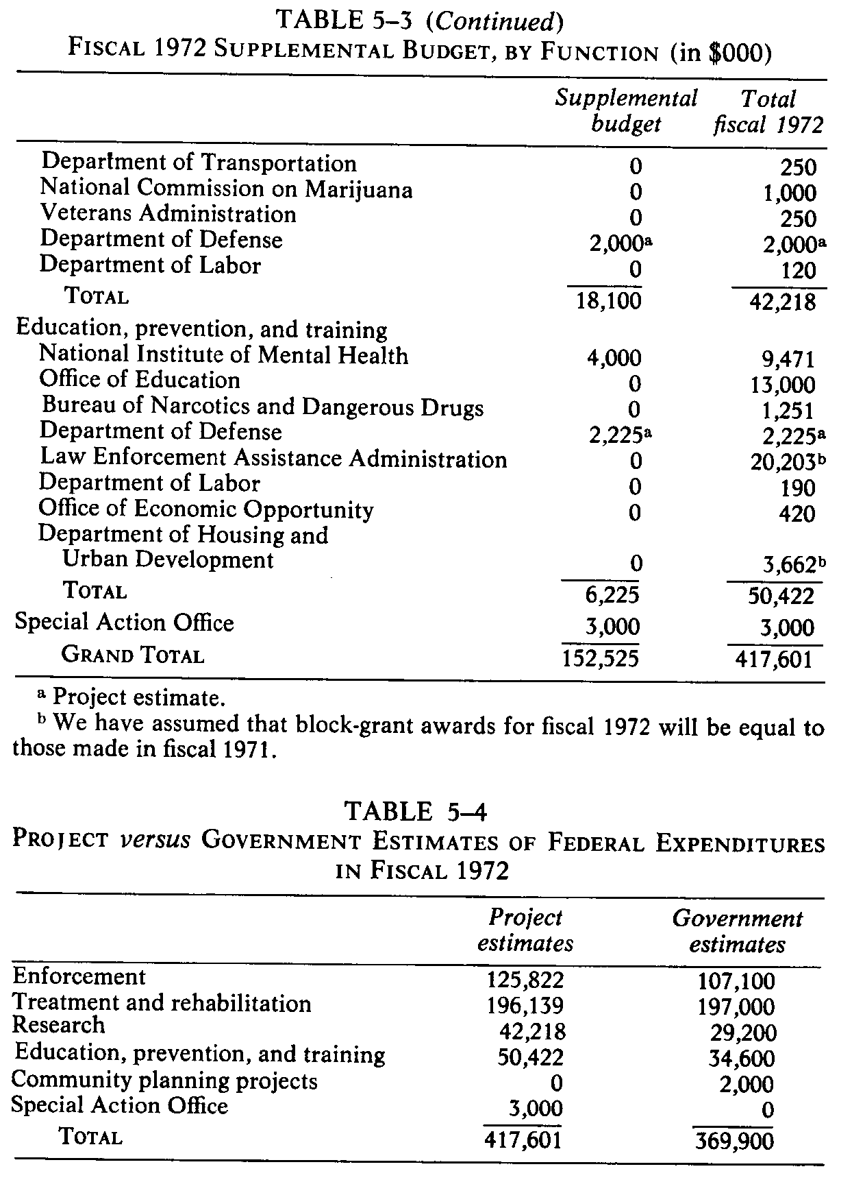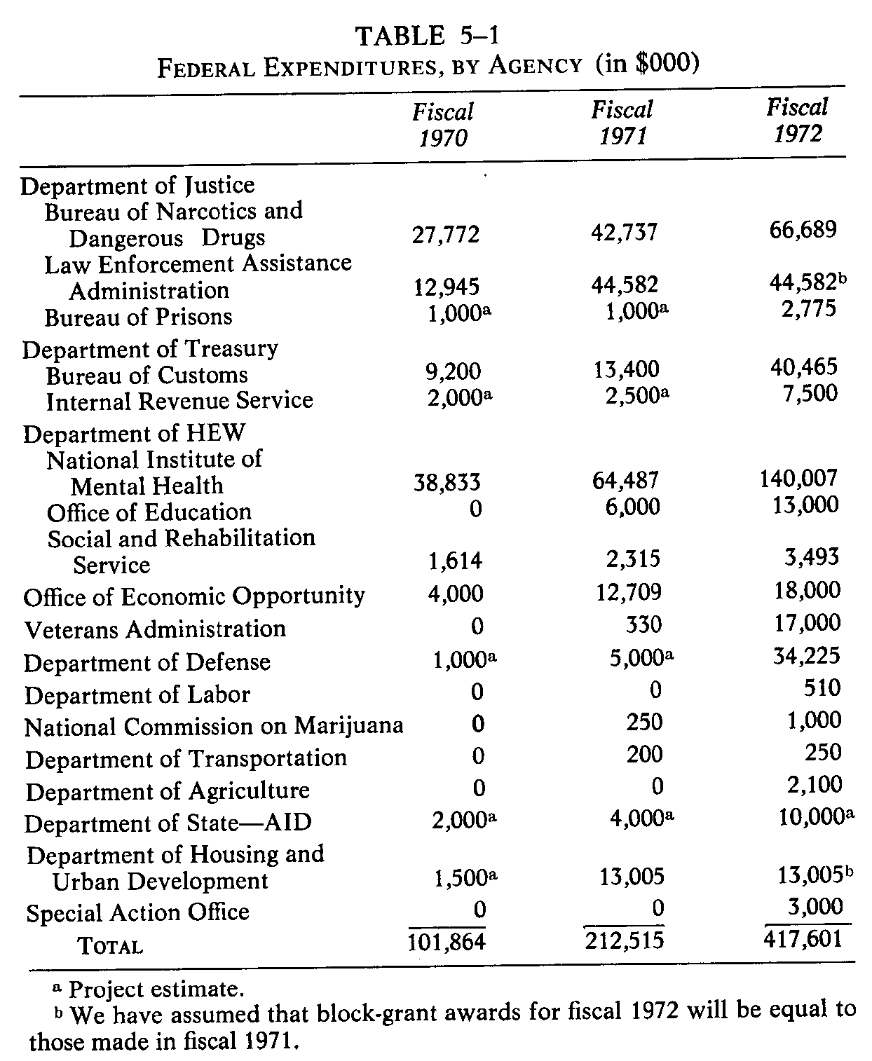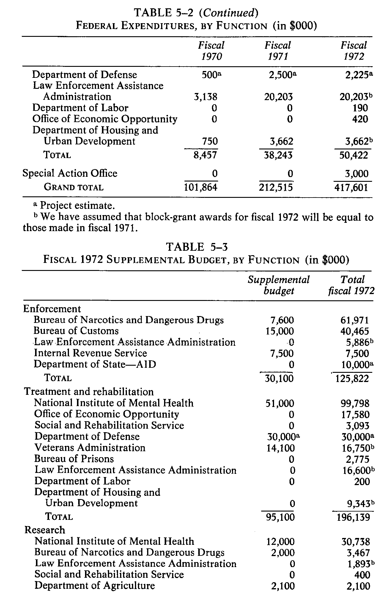 judgment and estimate rather than certain fact. TOTAL FEDERAL EXPENDITURES Table 5-1 shows federal expenditures for fiscal years 1970, 1971, and 1972 broken down by agencies. Table 5-2 shows the same expenditures broken down by functional categories. Table 5-3 shows the requested budget for fiscal 1972 before and after the President's supplement request. As the tables indicate, the government will spend about $417,601,000 on drug-abuse activities in fiscal 1972, almost double the amount spent in fiscal 1971. Several agencies that could not provide a breakdown of funds spent in fiscal 1971 could do so for fiscal 1972. To avoid undue exaggeration of the increase, we have made rough estimates of the fiscal 1971 totals. Table 5-4 compares the project estimate of the fiscal 1972 budget with the latest available official government estimates.' The Project's