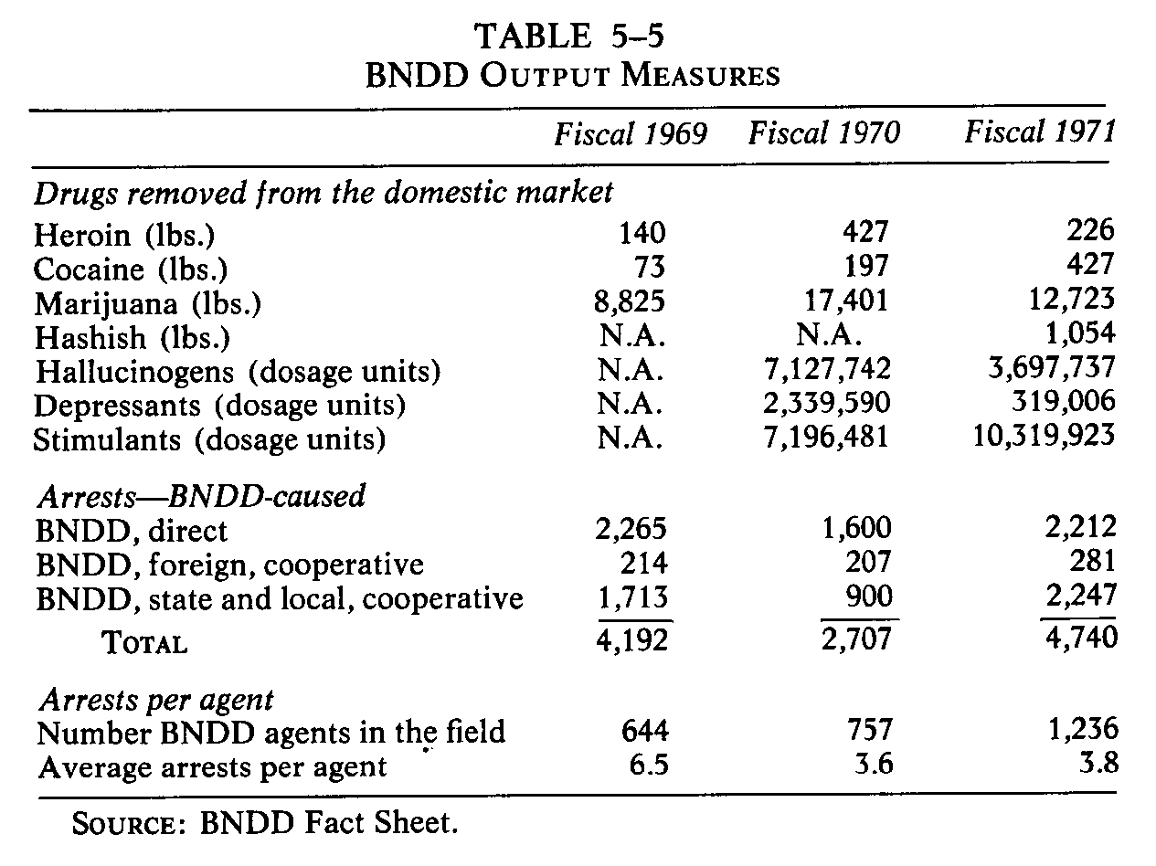 allocated to BNDD for international training and technicalassistance activities." TABLE 5-5 BNDD OUTPUT MEASURES Fiscal 1969 Fiscal 1970 Fiscal 1971 Drugs removed from the domestic market Heroin (lbs.) 140 427 226 Cocaine Obs.) 73 197 427 Marijuana (lbs.) 8,825 17,401 12,723 Hashish (lbs.) N.A. N.A. 1,054 Hallucinogens (dosage units) N.A. 7,127,742 3,697,737 Depressants (dosage units) N.A. 2,339,590 319,006 Stimulants (dosage units) N.A. 7,196,481 10,319,923 Arrests-BNDD-caused BNDD, direct 2,265 1,600 2,212 BNDD, foreign, cooperative 214 207 281 BNDD, state and local, cooperative 1,713 900 2,247 TOTAL 4,192 2,707 4,740 Arrests per agent Number BNDD agents in the field 644 757 1,236 Average arrests per agent ' 6.5 3.6 3.8 SOURCE: BNDD Fact Sheet. One of the chronic difficulties of law enforcement in the drug field is corruption, and the old Federal Bureau of Narcotics had a substantial problem. In the words of Attorney-General John Mitchell: There was considerable lack of integrity on the part of many of the agents of predecessor organizations. . . . Some of them have been indicted. Others have had administrative procedures instituted against them, and a lot of them have left. I believe that it is being overcome." However, because there is so much money in the drug trade, internal