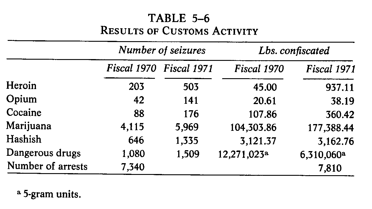 The Bureau of Customs is responsible for the prevention of smuggling. In fiscal 1972, the Customs budget for antidrug activities will be $40.5 million, $15 million of which will come from the supplemental budget request." Customs officials state that they will actually spend about $52 million in this area during fiscal 1972. This estimate is based on a performance-measurement system that uses random time-sample analysis to determine the allocation of effort of Customs personnel. Based on this same measurement system, Customs estimates that $31,600,000 was actually spent on antidrug activities during fiscal 1971.1' The results of Customs activity, as measured by the quantity of material seized and the number of arrests made, is shown in Table 5-6. For all categories except dangerous drugs, the quantity of material seized in fiscal 1971 exceeded that of the previous year, with heroin and cocaine showing the most dramatic increases. Customs officials say that about 5 per cent of their seizures are made as a result of tips and 95 per cent as a result of "cold searches'@--situations in which suspicions were based on conduct at the time of entry rather than on advance information." The Law Enforcement Assistance Administration (LEAA) was created in