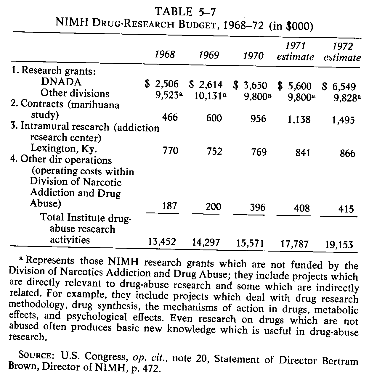 research." RESEARCH The National institute of Mental Health is the principal vehicle for government research on drug abuse. As concern about the problem has mounted, so has the NIMH drug-research budget. The growth curve is shown in Table 5-7, prepared for the House Select Committee on Crime by the director of NIMH. Probably the most important of the "other divisions" mentioned in the table is psychopharmacology, which is concerned primarily with the use of drugs in the treatment of mental illness. The supplemental budget presented by the President in June, 1971, increased the total amount for drug-abuse research in fiscal 1972 to $30.7 million. The allocation of this amount is not known.