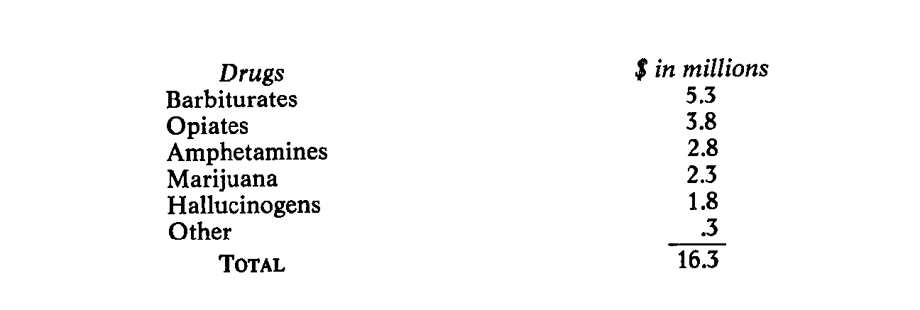 which we have figures, the distribution was as follows: Drugs $ in millions Barbiturates 5.3 Opiates 3.8 Amphetamines 2.8 Marijuana 2.3 Hallucinogens 1.8 Other .3 TOTAL 16.3 This total is higher than the total shown in Table 5-7, which notes only $15.6 million for 1970. Probably the material presented to Congress is correct, and the information in the breakdown by drugs represents preliminary estimates. Drug research draws on the disciplines of chemistry, pharmacology, sociology, psychology, psychiatry, and epidemiology, alone or in combination. There are no breakdowns by discipline, but NIMH does have a basic categorization of the areas within which it makes grants and contracts: 1. Systematic, controlled evaluation of currently promising treatment-program techniques 2. Development of treatment agents/devices for use in the treatment of drug dependence 3. Clinical studies of the effects of treatment drugs and abuse drugs 4. Surveys and instrument development to determine incidence, prevalence, and patterns of drug abuse: a. among students b. among other groups (hippies, psychiatric patients, etc.) c. New York City Narcotic Addict Register