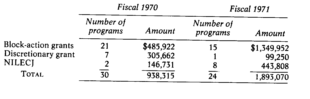 1. Planning grants-allocated to states according to population for the creation of statewide, comprehensive law-enforcement improvement plans. 2. Block-action grants-allocated to states according to population to carry out specific improvement plans. 3. Discretionary action grants-awarded at LEAA's discretion for