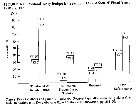 enormous growth of the federal response to illicit drugs which began in 1969. The Federal Response, 1969-1971 In January 1969 the federal government's response to illicit drugs as measured in dollars spent was small; $86 million was spent in fiscal year 1969 (FY 69), and only a modest increase to $101.9 million was requested for FY 70 .27 The principal federal agencies involved in the drug field during this period were the National Institute of Mental Health (NIMH) in the Department of Health, Education, and Welfare; the Bureau of Narcotics and Dangerous Drugs in the justice Department; and the Customs Bureau of the Treasury Department. These three agencies accounted for the bulk of the federal drug effort in four operational areas: treatment and rehabilitation; education, prevention, and training; research; and law enforcement. NIMH was the major federal sponsor of all non-law-enforcement programs, while BNDD and Customs each held some responsibility for the federal drug law enforcement effort. The emergence of BNDD created an intense bureaucratic rivalry with Customs regarding jurisdictional responsibilities for drug law enforcement programs. Although this dispute was supposed to have been settled in 1969 when BNDD was authorized to conduct overseas operations and Customs was restricted to border searches, it has surfaced frequently in subsequent years; even now the situation seems merely a temporary truce. (See Staff Paper 2, "Drug Law Enforcement Efforts," below.) The FY 71 budget was the first to be completely developed by the Nixon administration, and in it the federal drug budget more than doubled to a total of $212.5 million. The major increases in the FY 71 budget were for treatment and rehabilitation and education, prevention, and training. While the drug law enforcement budget rose by more than 50 percent, it was for the first time surpassed in absolute numbers by expenditures for treatment and rehabilitation, which by this time were assuming added dimensions as part of the crime reduction effort (see Figure 1. 1).