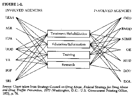 government's response to illicit drugs began. President Nixon's Message to Congress, June 17, 1971.19 President Nixon's message to Congress on June 17, 1971 raised the issue of illicit drug use to the highest level of government concern and responsibility. This statement was the culminating step in the declaration of a strong and irrevocable public commitment to reduce the crime heroin addicts were thought to commit and bring the problems of illicit drug use under control. "If we cannot destroy the drug menace in America , Nixon informed Congress and the American public, "then it will surely in time destroy us. I am not prepared to accept this alternative." Although the President spoke of the general problems of "drug abuse," there is little doubt that the chief problems and concerns to which he referred were those relating to heroin addiction. Clearly, public alarm about heroin-related crime and addicted Vietnam veterans demanded a more effective governmental response than previous ones. Equally clear was the fact that increased funding alone had not been successful. According to Nixon: "We must now candidly recognize that the deliberate procedures embodied in present efforts to control drug abuse are not sufficient in themselves. The problem has assumed the dimensions of a national emergency." Forceful measures were required, so the thinking went, if the twin problems of heroin addiction and urban crime were to be curtailed. Speed was essential to the Nixon administration because of the political aspects of illicit drug use. Predictably, the policies and programs it advocated were consistent with enforcement and quasi-enforcement approaches which had characterized past federal efforts. The government's response to the use of illicit drugs in 1971 sprang from the same assumptions about their innate harmfulness and arrived at fundamentally the same conclusions as had been espoused for more than sixty years. The changes proposed were those of technique, size, and scope only. The president acknowledged the problems of undirected growth in the government's response. We must recognize that piecemeal efforts, even where individually successful, cannot have a major impact on the drug abuse problem unless and until they are forged together into a broader and more integrated program involving all levels of government and private effort. We need a coordinated effort if we are to move effectively against drug abuse. A two-sided approach was developed to coordinate the federal drug effort. On the "supply" side were all federal drug law enforcement efforts to halt the illegal production, distribution, and use of prohibited substances. On the "demand" side were all federally sponsored efforts at treatment and rehabilitation and education, prevention, training, and research. Each approach was envisioned as separate and independent of the other, although they shared the same goals of eliminating illicit drug use and drug-related crime in America. To control "demand" the Nixon administration proposed a dramatic reorganization which would temporarily centralize responsibility for all federally sponsored efforts in drug treatment, rehabilitation, education, prevention, training, and research in a new White House Agency, the Special Action Office for Drug Abuse Prevention (SAODAP). The director of SAODAP was to be immediately accountable to the President. From an organizational standpoint it made sense to coordinate the many federal agencies involved. To have ignored the management problems displayed in Figure 1.2 above would have led to further chaos and undercut the potential of any federal response. However, this does not explain why such coordinative responsibilities were lodged in the White House under presidential supervision. Other federal programs also involved a number of federal agencies, yet coordination could usually be achieved through more regular bureaucratic measures such as cabinet- or sub-cabinet-level working agreements. What made the drug issue different? One explanation lies in the deteriorating relationship at that time between the White House staff and various federal agencies. Particularly with respect to the funding of methadone maintenance programs, the White House felt that there was considerable bureaucratic "foot-dragging. "30 Administration officials had become persuaded of the benefits of methadone maintenance as a way to reduce "heroin and criminal recidivism," but they had been unsuccessful in gaining the full support and cooperation of NIMH, the agency which normally would have funded and overseen these programs. NIMH officials were cautious of government "sanctioning one addiction [to methadone] in order to reduce the burden on society of heroin addiction,' and continued to resist White House pressures to fund a greater number of methadone programs .31 The administration contended that NIMH opposed the programs because to endorse the concept of methadone maintenance would have been tantamount to admitting the failure of the psychiatric profession to successfully treat heroin addiction .32 While mention of methadone is made only once in President Nixon's message to Congress, the proposed creation of SAODAP and the accompanying redelegation of authority would help circumvent NIMH and increase federal support for methadone. The administration sought thus to bypass-since it could not cajole-a reluctant bureaucracy. The president's designation of Dr. Jerome Jaffe-a prominent supporter of the use of methadone in treatment-as his Special Consultant for Narcotics and Dangerous Drugs until SAODAP could be legally constituted by Congress left no doubt as to the administration's intention. Indeed, when Dr. Jaffe assumed leadership responsibilities in mid-1971, there were 135 federally funded drug treatment programs; eighteen months later, with a significantly increased drug treatment budget, the number had nearly tripled to 394 .33 Treatment for heroin addiction was emphasized in th