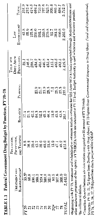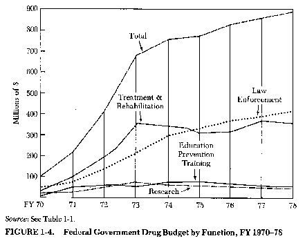 the best in us, it has led us to rely too heavily on our meaner, more punitive instincts. APPENDIX A: A Budget Perspective Overview of Fiscal Years 1970-1978. It is impossible to account exactly for all funds expended on the federal government's response to illicit drugs. The figures presented in this report are, however, sufficiently accurate to be used for an overall fiscal analysis and review of significant trends and priorities. Table 1. 1 presents the federal drug budget by function for fiscal years 1970-1978. From July 1969 through September 1978, the federal government spent approximately $5.7 billion on its drug-related efforts. Of this total, $2.4 billion was spent on treatment and rehabilitation, $2.3 billion on law enforcement, and the remainder ($.95 billion) was spent on education, prevention, and training ($.4 billion), research ($.4 billion), and planning ($.15 billion). The effect which the "war on drug abuse" had on the budget is clearly demonstrable beginning with FY 72 (which began July 1, 1971, two weeks after President Nixon's special message to Congress). (See Figure 1.4.) The most rapid expansion of the federal drug budget occurred during FY 72 and FY 73. After FY 74 and Nixon's "turn the corner" speech, the rate of budget expansion slowed considerably. (In fact, if adjusted for inflation, the buying power of the federal drug effort was lower in FY 78 than it had been since FY 72.) Still, although the annual rate of growth of the federal drug budget slowed, the absolute size at which its annual total more-or-less leveled off was much higher than ever before. The average annual federal drug expenditure for the years 1974-78 was over $800 million; for 1973-78-a six-and-one-quarter-year period-it totaled $5 billion. Perhaps the most useful index of federal priorities in the drug area is a comparison of