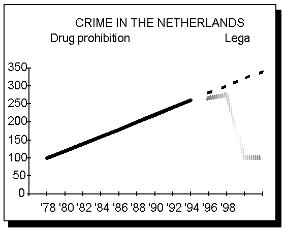 life-threatening criminal acts each year. Along with this reduction in numbers, the following should be considered. Simply put: a drug addict who does damage to his health has only himself to blame. In contrast, victims of violent crimes are victims through no fault of their own (if we leave aside acts of violence within the criminal world itself). The health gain as a result of avoiding violent crimes is, therefore, of a higher quality than if -theoretically- the same number of drug-casualties would occur as a result of legalisation. Conclusion: Controlling the drug problem is possible along the lines of "de-facto" or actual legalisation, and can be effectuated on a short term. Legalisation can take place without infringing on international treaties and without causing a flood of foreign drug tourists. The remaining illegal transit and export will be easier to fight than at present. Concern about an increased use of drugs is unfounded. Drugs will become common, not very interesting intoxicants, used by a minority whose health can be better served than at present. Legalisation will generate a yearly flow of money from VAT and excise duties from the coffeeshops and drug shops of at least 150 million Dutch guilders. In addition, the government will save at least 2 billion guilders a year on prisons, police and the administration of justice. We assume that this money will be used for combating the remaining crime. The reduction of costs for society as a whole as a result from the decrease of crime will amount to 4 - 6 billion guilders annually. Finally, legalisation of drug provides the cure for the ever-rising crime rate. Half of the prison capacity will become available instantly. As a result, and also because the capacity of the police and the administration of justice will double, total crime will decrease by 50-80%. If countries abroad would also switch to legalisation, the decrease will be even larger because the illegal transit and export would cease to exist. With the remaining crime amounting to only 50-20% of the