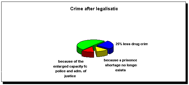 safer drug use. A similar campaign helped to reduce smoking by half. Chapter 6: The crime picture after legalisation. Drug crime is related to the production, trade and the use of drugs. The immediate consequences of legalisation are examined for the scenarios A, B and C. Complete legalisation will bring the following results: - Prison cells now occupied by dealers and junkies will become available. - This puts an end to the present shortage of cells. As a result, other types of crime will decrease with 10-20%. - The crime-fighting capacity of the police and the administration of justice will double, and result in a further reduction. - The total crime rate will decrease by 50-80%. Annual health gain: - At present 200-300 murders are committed every year, 30-50% of which are related to the drug trade; a reduction of 50% results in 100-150 violent deaths per year less. - At present there occur 3000 acts of serious violence per