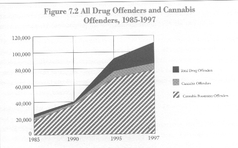 26 The number of people dealt with for drugs offences involving cannabis rose from 40,194 in 1990 to 86,034 in 1997. This was an increase of 114% and represented 76% of all drugs offences in 1997.